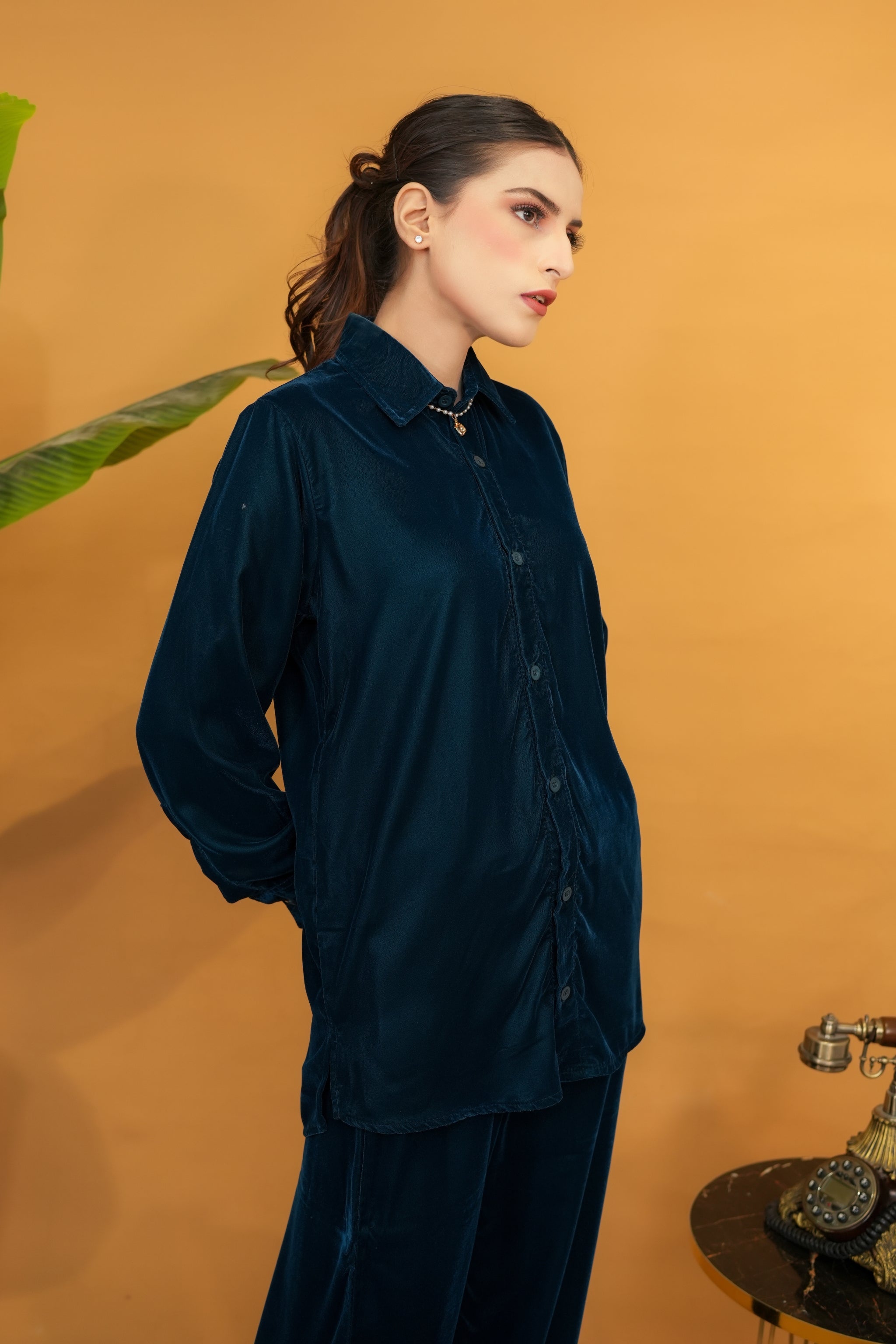 A stylish two-piece made from soft, plush velvet in a rich dark teal shade. It’s the perfect mix of comfort and class. Ideal for evening plans, get-togethers, or special moments.